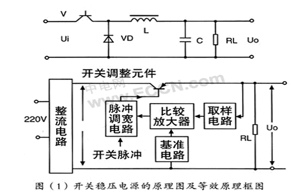 圖(1)畫(huà)出了開(kāi)關(guān)穩(wěn)壓電源的原理圖及等效原理框圖,它是由全波整流器,開(kāi)關(guān)管Vi,激勵(lì)信號(hào),續(xù)流二極管VD,儲(chǔ)能電感和濾波電容C組成。實(shí)際上,開(kāi)關(guān)穩(wěn)壓電源的核心部分是一個(gè)直流變壓器。這里我們對(duì)直流變換器和逆變器作如下解釋。逆變器,它是把直流轉(zhuǎn)變?yōu)榻涣鞯难b置。逆變器通常被廣泛地應(yīng)用在采用電平或電池組成的備用電源中。直流變換器,它是把直流轉(zhuǎn)換成交流,然后又把交流轉(zhuǎn)換成直流的裝置。這種裝置被廣泛地應(yīng)用在開(kāi)關(guān)穩(wěn)壓電源中。采用直流變換器可以把一種直流供電電壓變換成極性、數(shù)值各不同的多種直流供電電壓。
