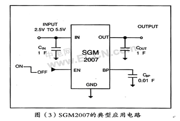 目前大多IC設(shè)計(jì)產(chǎn)商生產(chǎn)的低壓差線性穩(wěn)壓器(LDO)典型封裝都是SOT23-5和SOT23-3,如圣邦微電子的SGM2007,SGM2013。如圖(3)為SGM2007的典型應(yīng)用電路圖。