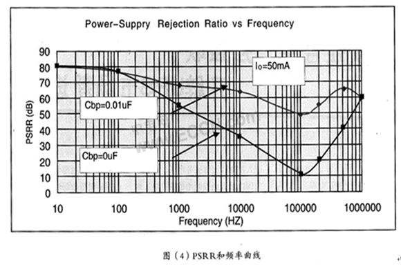電源抑制比PSRR(Power supply ripple rejectionratio)是反應(yīng)LDO輸出對(duì)輸入紋波抑制能力的一個(gè)交流參數(shù),一般輸出和輸入的頻率是一樣的,PSRR的值越大說(shuō)明LDO的紋波能力越強(qiáng),也就是說(shuō)輸入對(duì)輸出的影響很小。盡管LDO的電源抑制比很強(qiáng),但都是在一定頻率內(nèi)的抑制很強(qiáng),一般的在50KHz到200kHz的電源抑制比還是很差的如圖(4)為SGM2007的PSRR和頻率曲線,而這段頻率正是大多數(shù)開(kāi)關(guān)電源的工作頻率,如果LDO的負(fù)載和輸入輸出電容匹配不好,很容易引起LDO振蕩。而造成整個(gè)LDO供電系統(tǒng)的不穩(wěn)定。