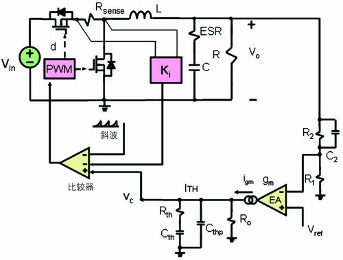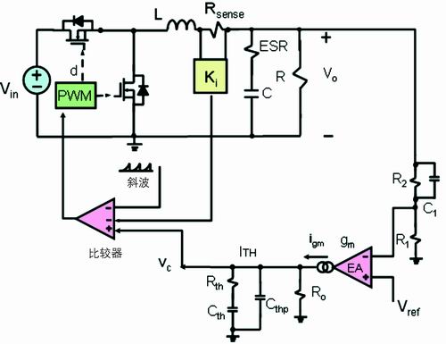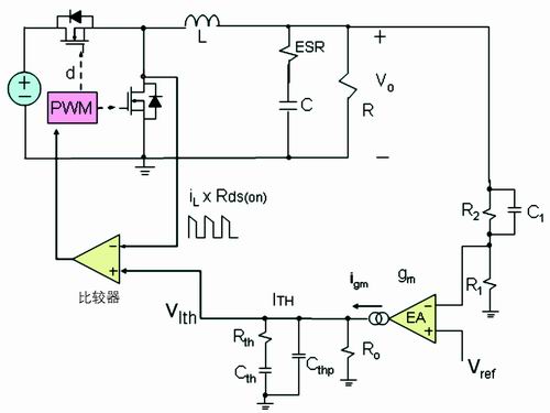 通過前面的討論可知,在每個開關周期,低端的開關管流過的電流波形為下降階段的梯形波。這種電流模式常稱為谷點電流模式。和峰值電流模式一樣,谷點電流模式反饋也有兩個環(huán)路:一個電壓外環(huán),另一個是電流內(nèi)環(huán)(見圖2)。