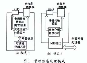 收發(fā)器網(wǎng)管功能的實現(xiàn)有兩種方式:一種是在收發(fā)器電路板上配置網(wǎng)絡(luò)管理信息處理器——可編程邏輯芯片來處理網(wǎng)管信息,該芯片利用OEMC上的雙向管理指令接口(Managenent Data Input/Output,MDIO)、管理數(shù)據(jù)同步時鐘輸入接口(ManagenentData Clock,MDC)及被管理信息輸入/輸出管腳等接口來獲取管理信息,管理信息與網(wǎng)路上的普通數(shù)據(jù)共用數(shù)據(jù)通道,如圖1(a)所示。第二種方式如圖1(b)所示,收發(fā)器上沒有管理信息處理器,收發(fā)器外部的網(wǎng)絡(luò)管理者通過MII接口獲取管理信息。可見,有網(wǎng)管功能的收發(fā)器,其元器件種類及數(shù)量遠(yuǎn)遠(yuǎn)多于無網(wǎng)管收發(fā)器,相應(yīng)地,其布線復(fù)雜,開發(fā)周期長。
