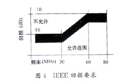 雙絞線中的每對導(dǎo)線以雙螺旋形結(jié)構(gòu)相互纏繞。如圖2所示,共模電流Icom在兩根導(dǎo)線上以相同方向流動,并經(jīng)過寄生電容Cp到地返回。在這種情況下,電流產(chǎn)生大小相等極性相同的磁場 ,它們的輸出不能相互抵消,引起射頻干擾,嚴(yán)重時有可能會造成電路板癱瘓。因此,設(shè)計者必須采取措施予以防范:除了保證布線合理外,選擇有效的濾波元件也是重要的一方面。磁模塊的共模扼流器部分可以有效地減少共模信號引起的射頻干擾。如圖3所示:共模電流以相同的方向流過共模扼流圈繞組的每一邊,建立大小相等相位相同的相加磁場使共模扼流圈對共模信號呈現(xiàn)高阻抗,通過共模扼流圈的共模電流大大地減弱。磁模塊主要的參數(shù)有:漏電感、線間電容和回?fù)p。一般地,漏電感和線間電容越小性能越好,而回?fù)p應(yīng)當(dāng)符合ANSIX3.263 TP-PMD規(guī)定,如圖4所示。