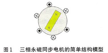 三相混合式步進(jìn)電機(jī)的工作原理十分類似于永磁同步伺服電機(jī)。其轉(zhuǎn)子上所用永磁磁鐵同樣是具有高磁密特性的稀土永磁材料,所以在轉(zhuǎn)子上產(chǎn)生的感應(yīng)電流對轉(zhuǎn)子磁場的影響可忽略不計(jì)。在結(jié)構(gòu)上,它相當(dāng)于一種多極對數(shù)的交流永磁同步電機(jī)。由于輸入是三相正弦電流,因此產(chǎn)生的空間磁場呈圓形分布,而且可以用永磁式同步電機(jī)的結(jié)構(gòu)模型(見圖1)分析三相混合式步進(jìn)電機(jī)的轉(zhuǎn)矩特性。為便于分析,可做如下假設(shè):