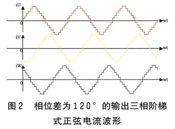 以上分析表明,對于三相永磁同步電機(jī),當(dāng)三相繞組輸入三相對稱的正弦電流時(shí),由于在內(nèi)部產(chǎn)生圓形旋轉(zhuǎn)磁場,電機(jī)的輸出轉(zhuǎn)矩為恒值。因此,將交流伺服控制原理應(yīng)用到三相混合式步進(jìn)電機(jī)驅(qū)動系統(tǒng)中,輸入的220V交流,經(jīng)整流后變?yōu)橹绷?,再?jīng)脈寬調(diào)制技術(shù)變?yōu)槿冯A梯式正弦波形電流(見圖2),它們按固定時(shí)序分別流過三路繞組,其每個(gè)階梯對應(yīng)電機(jī)轉(zhuǎn)動一步。