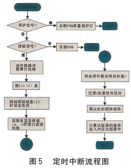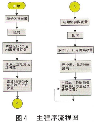 圖4示出主程序流程圖,圖5示出定時(shí)中斷流程圖。為減少功耗和保護(hù)電機(jī),設(shè)置了自動半電流功能(靜態(tài)鎖軸或沒有脈沖輸入時(shí)電流減半),它由滯環(huán)比較器自動進(jìn)行調(diào)節(jié)。