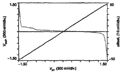 在中部電源電壓區(qū),PMOS和NMOS輸入對(duì)是有效的,而且它們的偏置電流通過(guò)電流鏡M4P--M5P和M4N--M5N鏡像到該電路的輸出端。這種結(jié)構(gòu)允許NMOS輸入對(duì)驅(qū)動(dòng)在電源電壓區(qū)的輸出節(jié)點(diǎn)接近VDD.而PMOS控制輸出端的電壓范圍接近VSS.不幸的是,在接近VDD時(shí),P溝道輸入對(duì)截止,而且沒有電流被鏡像到輸出端的底部,關(guān)閉了緩沖器。類似的情況是VSS時(shí).N溝道差分對(duì)不是有效的。為了這個(gè)原因,晶體管M1PR-M5PR和MlNR-M5NR已包括在圖2中,維持在整個(gè)電壓范圍內(nèi)是有效的。