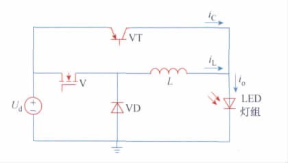 電路如圖1 所示。電路結(jié)構(gòu)以BUCK電路為主,取消電解電容濾波,用輔助線性電路對(duì)電感紋波電流進(jìn)行補(bǔ)償。圖中由開(kāi)關(guān)管V、電感L、LED 燈組、續(xù)流二極管VD 組成主電路; 晶體管VT 為輔助補(bǔ)償電路。
