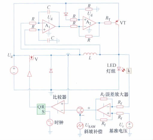 本文提出一種有源紋波補(bǔ)償BUCK 型LED 驅(qū)動(dòng)電路。該電路無(wú)需使用大容量電解電容,所需要的小容量電容可以采用能量密度較小的新型長(zhǎng)壽命電容,利用有源補(bǔ)償技術(shù)抑制輸出紋波電流。由于取消電解電容的使用,可以使電路壽命增長(zhǎng),穩(wěn)定性提高,便于集成,電路易小型化。