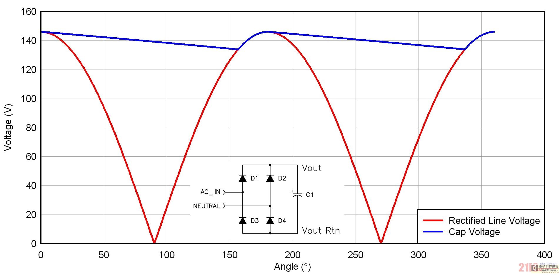 圖 1 和圖 2 顯示了離線電源中使用的兩種整流器配置結構。圖 1 為一個全波橋接,其中,AC 輸入電壓經過簡單整流以后便被送至電容。這種電路常見于寬范圍 AC 和 230 伏 AC 應用中。電容充電至正弦波峰值,然后在大部分半周期放電。電容紋波電流包括兩個部分:首先是充電周期,其電流由電容值和所應用的 dV/dt 決定;其次是電容放電。電源起到恒定電源負載的作用,因此電容以非線性速率實施放電,其計算方法為:W = ½ * C *V^2 = P * dt。