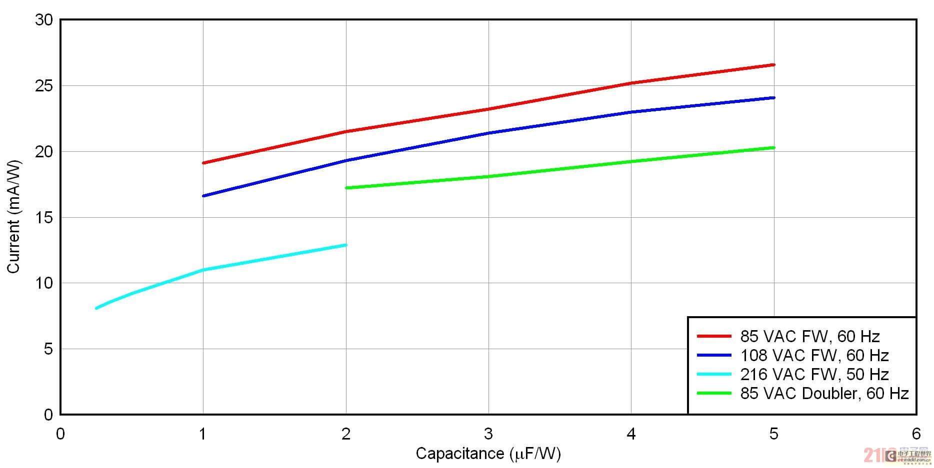 [page]圖 3 顯示了四種整流器/輸入電壓方法的 uF/W 標準化壓降。共有三種全波橋接方法,適用于低線壓美國(108 VAC/60 Hz)、低線壓日本(85 VAC/50 Hz)和低線壓歐洲(216 VAC/50 Hz)。另外,還有一個低線壓日本的倍壓器。就全波橋而言,標準化過程只需將電容除以功率。在倍壓器中,標準化方法是將兩個串聯電容之一的電容除以功率。要想使用該曲線圖,請首先確定您的整流器配置結構,并選擇一個可以接受的壓降。之后,您只需讀取輸入電容的 uF/W 便可。最后,通過乘以您的功率,便可去標準化。