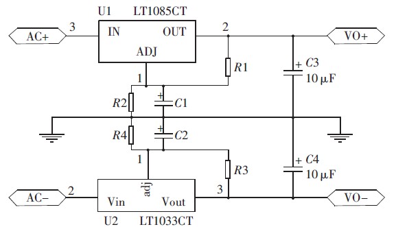 LT1083/LT1033 系列正負可調(diào)穩(wěn)壓器的效率大大高于現(xiàn)有器件,可以提供7.5 A、5 A 和3 A 輸出電流,并能在低至1 V 的壓差條件下運行,壓降在最大電流條件下保證在1.5 V 以內(nèi)。負載電流減小時允許壓差同時減小,可在多種電流水平條件下通過片內(nèi)修整電路,提供所保證的最小壓差,并能夠使輸出電壓準確度調(diào)節(jié)至1%.其電壓調(diào)整率為0.015%,負載調(diào)整率為0.01%,對電流限值也進行了修整,最大限度地減小了過載條件下穩(wěn)壓器和電源電路上承受的應力,具有熱功耗限制保護[10].LT1083/LT1033 系列器件的引腳與老式三端穩(wěn)壓器兼容,與大多數(shù)穩(wěn)壓器設(shè)計中的10 μF 輸出電容器以及PNP 穩(wěn)壓器多達10%的輸出電流作為靜態(tài)電流消耗不同,LT1083/LT1033 系列的靜態(tài)電流流入負載, 大大降低了電源功耗。此芯片電壓調(diào)整率小、負載調(diào)整率小的特點能夠保證輸出電壓穩(wěn)定度高。正負線性穩(wěn)壓模塊電路如圖3 所示,其中R1=R3,R2=R4.電路中的電阻參數(shù)可根據(jù)輸出可調(diào)電壓公式確定: