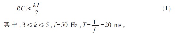 整流濾波電路主要由整流橋堆和大容量濾波電容組成, 如圖2 所示。整流橋堆具有體積小巧、輸出電流大、安裝方便等優(yōu)勢, 并能代替由4 只二極管組成的傳統(tǒng)橋式整流電路。濾波電路采用大容量電解電容濾波,增加了輸出電壓的穩(wěn)定性。根據(jù)式(1) 可求出所需濾波電容容量。
