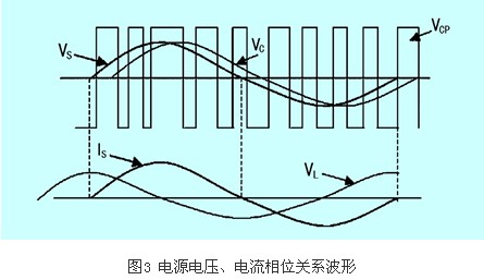 功率因數(shù)控制到1.0實際上就是設(shè)法使電源電流is與電壓vs同相位。因此,只要讓調(diào)制正弦參考波落后電網(wǎng)電壓vs一個角度,整流器網(wǎng)側(cè)輸出的PWM電壓vcp的基波分量vc落后于vs,使電流is與電壓vs同相,整流器工作在整流狀態(tài),而且功率因數(shù)控制在1.0,如圖3所示。