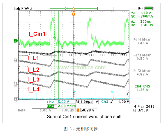圖 3 顯示的范圍圖片涵蓋所有四個開關(guān)階段中的電感器電流與去耦合通道 1 的輸入電容器的脈沖電流。