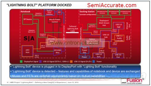 從硬件層面上看,Lightning Bolt其實(shí)很簡單,驅(qū)動級的硬件兼容性使得芯片上的USB通道及APU上的DP通道用一條線纜就可以連接起來并輸出到hub上。