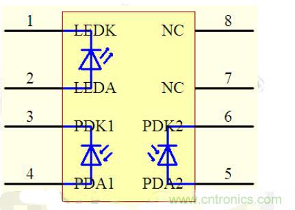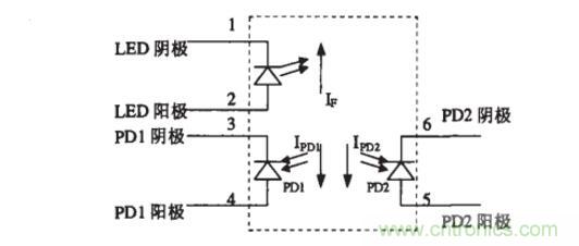 HCNR200/201包括一只高性能的發(fā)光二極管(圖中的LED),兩只極其相似的光電二極管(圖中的PD1和PD2)。當LED中流過電流If時。其發(fā)出的光會在PD1和PD2中感應(yīng)出正比于LED發(fā)光強度的光電流Ipd1和Ipd2。由于PD1和PD2的特性非常相似,再加上安裝位置的精確性以及元件先進的封轉(zhuǎn)設(shè)計保證了該元件的高線性度和增益的穩(wěn)定性。