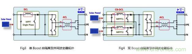 目前廣泛采用的非隔離并網(wǎng)住宅型光伏逆變器,其功率基本上為1.5 KW ~ 6 KW左右。為了實現(xiàn)高的性價比,并最大限度地提高轉(zhuǎn)換效率,業(yè)界甚至采用了SiC半導(dǎo)體、H5拓?fù)洹?電平拓?fù)涞雀鞣N新式技術(shù),但其最基本的拓?fù)洳煌夂鯃D3、4兩種: