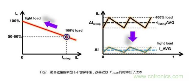 從中可知,要顯著提高其綜合效率,就必須最大限度地控制好較輕負(fù)荷時的功率損耗。利用混合磁路中不同磁材的特性,通過對其磁路長度、磁阻及繞線匝數(shù)等影響電感特性的諸要素進行優(yōu)化調(diào)節(jié),使之符合圖7所示的L-I直流電感偏置特性,從而可實現(xiàn)歐效改善與低成本設(shè)計的兼顧。