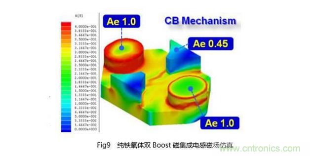 對于這種新型高效電感的設(shè)計,和Boost電感設(shè)計要求一樣,要求該電感在大紋波電流工作時,保持極佳的效率。由于其電感量可以設(shè)計成比較小的感值,即使要求直流內(nèi)阻較低,用銅量也能得到大幅的控制。對于磁性材料中的ΔB磁場變化率大的問題,同樣地采用Hybrid Magnetics技術(shù),可以控制磁性的損耗、減少漏磁的存在,達到很少的用銅量也能保持很低的內(nèi)阻的目的。