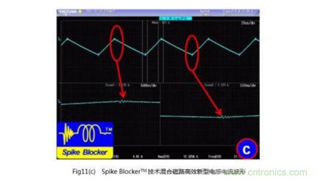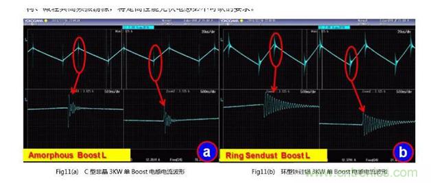 圖11(a)為目前廣為采用的C型非晶材料繞制的3 kW單Boost電感的額定功率時的典型工作電流波形。在Boost開通和關(guān)斷時,電感電流出現(xiàn)了比較嚴(yán)重的高頻振蕩,其振蕩頻率成分也比較豐富,約在20~30 MHz寬帶上;Fig11(b)為采用數(shù)只φ47的鐵硅鋁磁環(huán)繞制的3 kW單Boost電感的波形,同樣圖中顯示出10 MHz左右的高頻衰減振蕩;Fig11(C)則為采用了優(yōu)化結(jié)構(gòu)和相關(guān)設(shè)計工藝規(guī)范的Spike Blocker TM技術(shù)后,使用Hybrid Magnetics混合磁路設(shè)計的新型高效能電感的實測波形(這些測試均基于相同設(shè)備、相同輸入輸出電壓、功率、工作頻率條件),由此可見,關(guān)注電感的EMC設(shè)計工藝規(guī)范具有十分重要的意義。