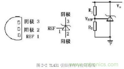 TL431是由德州儀器生產(chǎn)的可控精密穩(wěn)壓源,實物如圖2-3所示。它的輸出電壓用兩個電阻就可以任意的設(shè)置到從2.5V到36V范圍內(nèi)的任何值。該器件的典型動態(tài)阻抗為0.2Ω,在很多應(yīng)用中用它代替穩(wěn)壓二極管,例如,數(shù)字電壓表,運放電路,可調(diào)壓電源,開關(guān)電源等。圖2-2所示為TL431引腳排列與使用連線圖。