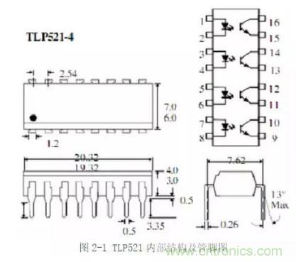 常用于反饋的光耦型號有TLP521、PC817等。這里以TLP521為例,介紹這類光耦的特性。圖2-1所示為光耦內(nèi)部結(jié)構(gòu)圖以及引腳圖。