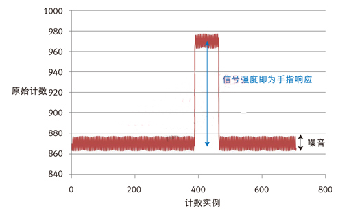 圖5:原始傳感器數(shù)據(jù)由手指響應和噪音構成。手指響應,也稱為信號強度,是當手指放在傳感器上時通過感應系統(tǒng)可以看到的原始計數(shù)的差別