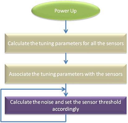 噪聲是一個隨機時間函數(shù),由其自身性質(zhì)決定。工作一個小時后和剛開機時是不一樣的,下一個時刻又不相同。因此,手指檢測的閾值應基于傳感器原始計數(shù)檢測到的噪聲來調(diào)整。圖8顯示了自調(diào)試系統(tǒng)如何基于系統(tǒng)噪聲調(diào)整手指閾值。