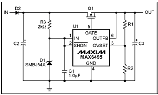 過壓保護(hù)(OVP)器件數(shù)據(jù)資料中提供的典型電路可以滿足大多數(shù)應(yīng)用的需求(圖1)。然而,有些應(yīng)用需要對基本電路進(jìn)行適當(dāng)修改。本文討論了兩種類似應(yīng)用:增大電路的最大輸入電壓,在過壓情況發(fā)生時(shí)利用輸出電容存儲(chǔ)能量。