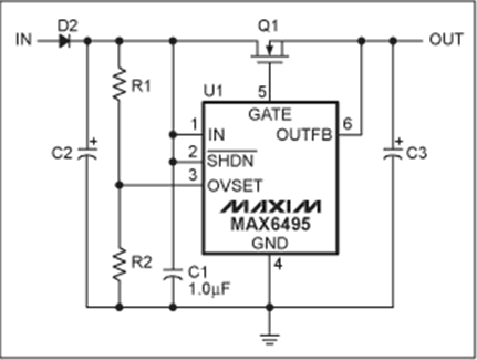 MAX6495–MAX6499/MAX6397/MAX6398過壓保護(hù)(OVP)器件用于保護(hù)后續(xù)電路免受甩負(fù)載或瞬間高壓的破壞。器件通過控制外部串聯(lián)在電源線上的n溝道MOSFET實(shí)現(xiàn)。當(dāng)電壓超過用戶設(shè)置的過壓門限時(shí),拉低MOSFET的柵極,MOSFET關(guān)斷,將負(fù)載與輸入電源斷開。