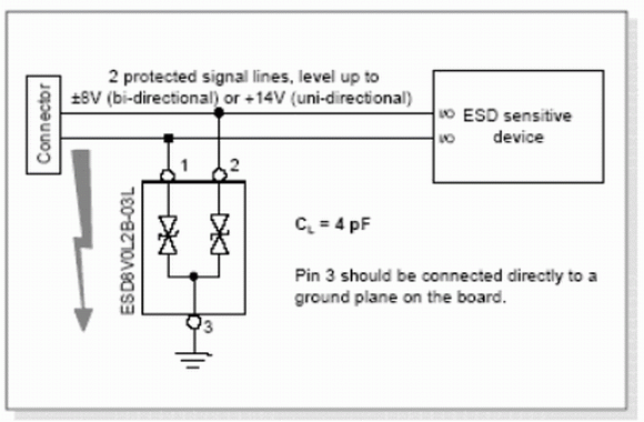 如圖4所示,USB2.0傳輸鏈路的差分數(shù)據(jù)線應(yīng)連接至ESD8V0L2B-03L的管腳1和管腳2上。二極管的管腳3接地。由每個二極管產(chǎn)生的線路電容都是4pF,差分線間的電容為2pF。