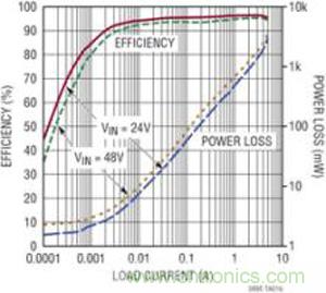 圖 2:LTC3895 在 24V或 48V 輸入、12V 輸出時(shí)的效率曲線