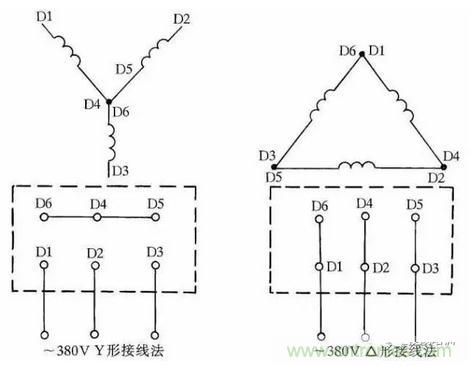 圖1:三相交流電動機(jī)Y形和△形接線方法