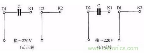 圖247為IDD5032型單相電容運(yùn)轉(zhuǎn)電動機(jī)接線方法。其功率為60W,電容選用耐壓500V、容量為4μF的產(chǎn)品。圖3(a)為正轉(zhuǎn)接線,圖3(b)為反轉(zhuǎn)接線。