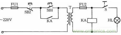 工作原理:閉合S后,按下按鈕SB1,變壓器得電輸出36V低電壓,使得繼電器或交流接觸器KA吸合。放松按鈕SB1后,KA自鎖觸點(diǎn)使KA保持吸合,繼續(xù)給變壓器接通電源。如果變壓器次級發(fā)生短路故障,繼電器線圈電壓為零,此時KA便失電釋放,將變壓器電源斷開,保護(hù)變壓器不被破壞。