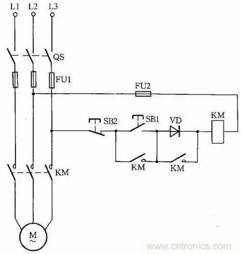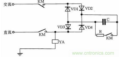 因?yàn)閱与娏鬏^大,所以這種線路只適用于操作不頻繁的場合。線路中,VD應(yīng)選用耐壓大于700V的二極管,電流要根據(jù)交流接觸器線圈電流而定。