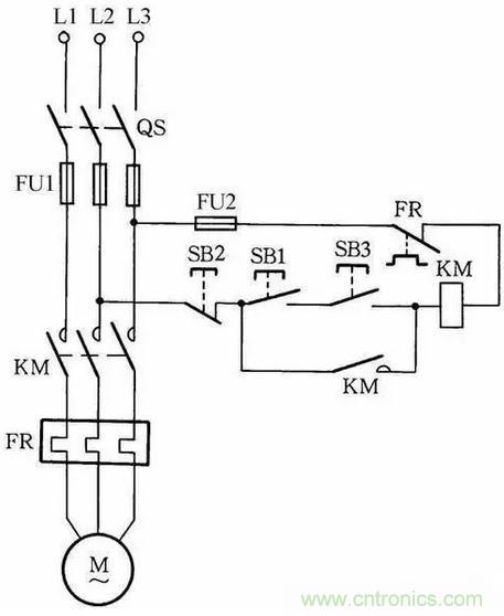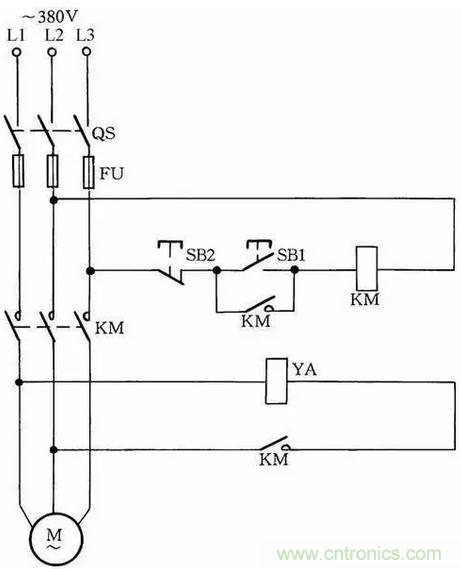 圖中SB2為停止按鈕,在停止時,按動SB2的時間要長一點(diǎn)。否則,手松開按鈕后,接觸器又吸合,使電動機(jī)繼續(xù)運(yùn)行。這是因?yàn)殡娫措妷弘m被切斷,但由于慣性的作用,電動機(jī)轉(zhuǎn)子仍然轉(zhuǎn)動,其定子繞組會產(chǎn)生感應(yīng)電動勢,一旦停止按鈕很快復(fù)位,感應(yīng)電動勢直接加在接觸器線圈上,使其再次吸合,電動機(jī)繼續(xù)運(yùn)轉(zhuǎn)。