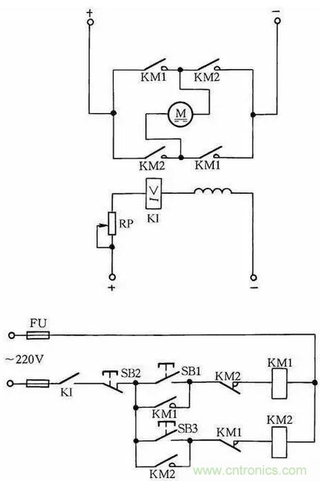 在勵磁電路內(nèi),串聯(lián)一個欠電流繼電器KI,其常開觸點(diǎn)接在控制電路中。當(dāng)勵磁電流消失或減小到設(shè)定值時,KI釋放,KI常開觸點(diǎn)斷開,切斷電動機(jī)電樞電源,使電動機(jī)停轉(zhuǎn),從而避免超速現(xiàn)象發(fā)生,見圖11。