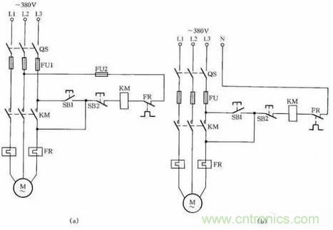 接觸器線圈電壓為380V時,可按圖12(a)所示接線;接觸器線圈電壓為220V時,可按圖12(b)接線。圖12(a)的接線還有缺陷,即在電動機(jī)停轉(zhuǎn)時,其引出線及電動機(jī)帶電,使維修不大安全。因此,這種線路只能在應(yīng)急時采用,并在維修電動機(jī)時,應(yīng)斷開控制電動機(jī)的總電源開關(guān)QS,這一點(diǎn)應(yīng)特別注意。