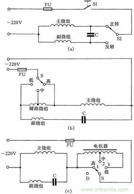 圖16(b)為帶輔助繞組的接線線路,撥動開關(guān)S,可改變輔助繞組的抽頭,即改變主繞組的實(shí)際承受電壓,從而改變電動機(jī)的轉(zhuǎn)速,此接線方法常用于電風(fēng)扇上。