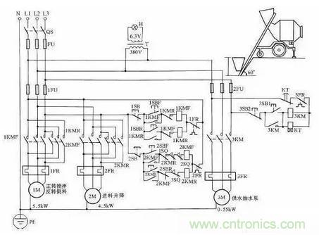 這時料斗已升到預(yù)定位置,把料自動倒到攪拌機(jī)內(nèi),并自動停止上升。此時操作人員按下下降按鈕2SBR時,卷揚(yáng)系統(tǒng)帶動料斗下降,待下降到其料口與地面平齊時,擋鐵碰撞行程開關(guān)3SQ,使2KMR接觸器斷電釋放,自動停止下降,為下次上料做好準(zhǔn)備,這時攪拌機(jī)料已備好,操作人員再按下3SB1,3KM接觸器得電吸合,使供水抽水泵電動機(jī)3M運(yùn)轉(zhuǎn),向攪拌機(jī)內(nèi)供水,與此同時,時間繼電器KT得電工作,待供水與原料成比例后(供水時間由KT時間繼電器調(diào)整確定,根據(jù)原料與水的配比確定),KT動作延時結(jié)束,從而使3KM自動釋放,供水停止。