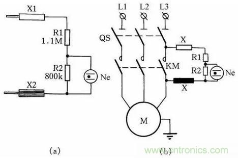 如果絕緣電阻合乎標(biāo)準(zhǔn)(即絕緣電阻值大于0.5MΩ),則泄漏電流很小時,在R2上的電壓降小于氖泡的點(diǎn)燃電壓,Ne不亮;當(dāng)任意兩相或三相同時對機(jī)殼的絕緣電阻降低時,泄漏電流大增,使氖泡Ne點(diǎn)燃,從而可判定絕緣不合格。