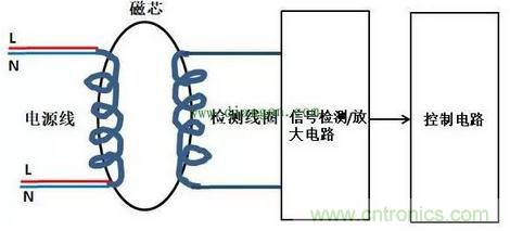 如圖1所示,漏電保護器正常工作時,因未漏電,故只有零線和火線有電流流動,即i1不存在,i0=i2,通過圖2分析得知,由于零線和火線電流大小相等,方向相反磁場相互抵消,故磁芯不生產(chǎn)耦合磁場,圖4的檢測線圈不生產(chǎn)感應電勢,控制電路不動作;當有漏電發(fā)送時,i1電流存在,火線電流i0=i1+i2,零線電流為i2,火線電流大于零線電流,不對稱,故磁芯有耦合磁場傳遞到檢測線圈那,檢測線圈產(chǎn)生感應電勢,導致控制電路動作切斷電源。