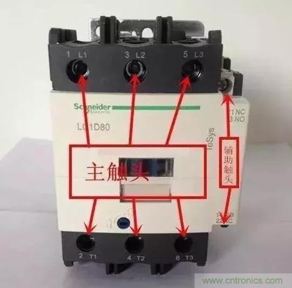 380伏交流接觸器有三個(gè)主觸頭,也就是電源進(jìn)線和負(fù)載端出線,進(jìn)線分別是三相火線L1、L2、L3,負(fù)載端出線分別是T1、T2、T3,接觸器主觸頭進(jìn)線和出線上下一一對應(yīng),分別是L1對應(yīng)T1,L2對應(yīng)T2,L3對應(yīng)T3,主觸頭在接觸器不吸合的狀態(tài)下是常開狀態(tài)。