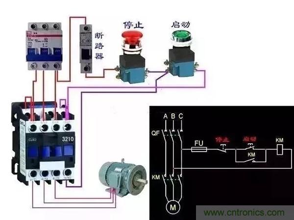 明白了實(shí)物接線以后我們再看電路圖就很容易理解了,右方是接觸器自鎖電路圖,ABC分別電表三相火線電源,QF開關(guān),KM是接觸器,F(xiàn)U是熔斷器,KM帶個(gè)方口就是接觸器線圈電源,按鈕的位置,連在一起的是要接常閉,分開的是要接常開,圓圈M 是負(fù)載電動機(jī),根據(jù)實(shí)物接線圖再結(jié)合自鎖電路圖!