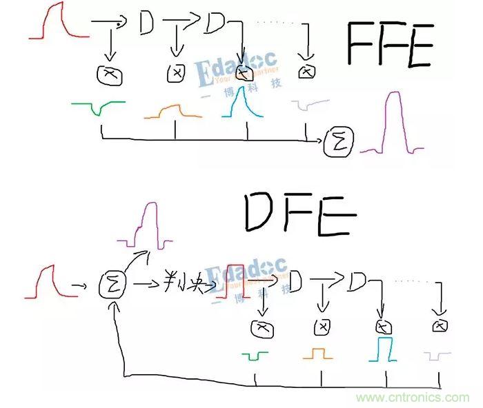 DFE (Decision Feedback Equalizer, 判決反饋均衡器)。這兩個就跟FIR比較像。只不過FIR中的乘法器是乘一個脈沖信號,而FFE與DFE中的乘法器,乘以信號本身。看圖理解: