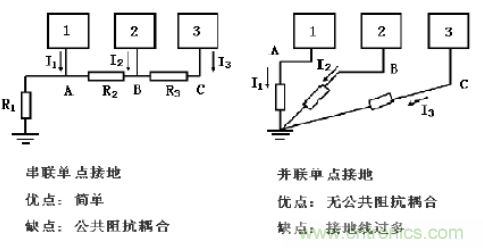 單點接地有兩種類型,一種是串聯(lián)單點接地,另一種是并聯(lián)單點接地。如圖8-3所示。