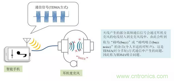 通信電波的高頻信號侵入到麥克風線中時,揚聲器會發(fā)出稱為"蜂鳴(buzz)"或"蜂鳴噪音(buzz noise)"的雜音(令人不適的可聽聲)。由于以前在TDMA(時分多址)方式的電話中出現(xiàn)過重大問題,因此普遍稱為TDMA噪音。圖1所示為在智能手機中連接耳機麥克風時產(chǎn)生TDMA噪音事例的示意圖。進行蜂窩通信時,高頻信號侵入到麥克風線中導致產(chǎn)生TDMA噪音。