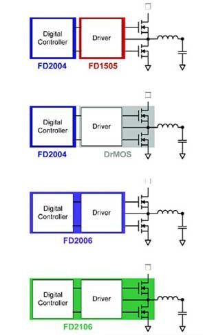 FD2004可以與外部柵極驅(qū)動(dòng)器 (如FD1505) 和分立式MOSFET ,或是集成了驅(qū)動(dòng)器與MOSFET的單封裝DrMOS產(chǎn)品協(xié)同工作。它還可以在獨(dú)立式應(yīng)用中通過電阻 來編程—特別地,輸出電壓的最大值由電阻設(shè)定,且利用軟件命令設(shè)定的電壓最大值不得超過10%以上,以保護(hù)負(fù)載。在需要較大電流的應(yīng)用中,如多相轉(zhuǎn)換器,所選的架構(gòu)可實(shí)現(xiàn)多達(dá)8個(gè)相位的電流共享,而且可在輸出功率較低時(shí)實(shí)現(xiàn)切相 (phase shedding) 來保持高效率。該款控制器基于帶自適應(yīng)性能算法和環(huán)路補(bǔ)償?shù)臄?shù)字控制環(huán)路,支持高達(dá)1.4MHz的開關(guān)頻率。時(shí)鐘同步可協(xié)助提升EMI性能。對(duì)于同時(shí)需要集成式驅(qū)動(dòng)器和分立式外部MOSFET的應(yīng)用,FD2006也是個(gè)不錯(cuò)的選擇。