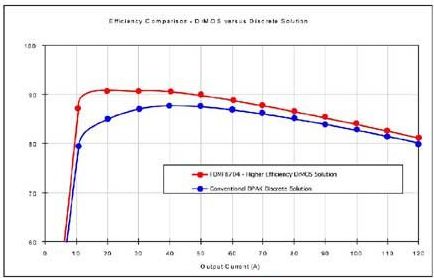 帶有Power56 MOSFET和SO-8驅(qū)動(dòng)器的分立式解決方案的板卡占位面積在120mm2左右,而MCM只需要64mm2或36mm2。后者模塊中的各個(gè)器件經(jīng)精心挑選并全面優(yōu)化,相比分立式解決方案其性能更高,熱性能也更好 (圖6和圖7)。受電腦行業(yè)的推動(dòng),這種解決方案可使電流高達(dá)30A,并針對(duì)最高1MHz的開關(guān)頻率優(yōu)化。甚至在大電流設(shè)計(jì)中即使考慮到熱設(shè)計(jì)規(guī)則,也無需散熱器,因系統(tǒng)中空氣流對(duì)于該芯片散熱是足夠的。[page]